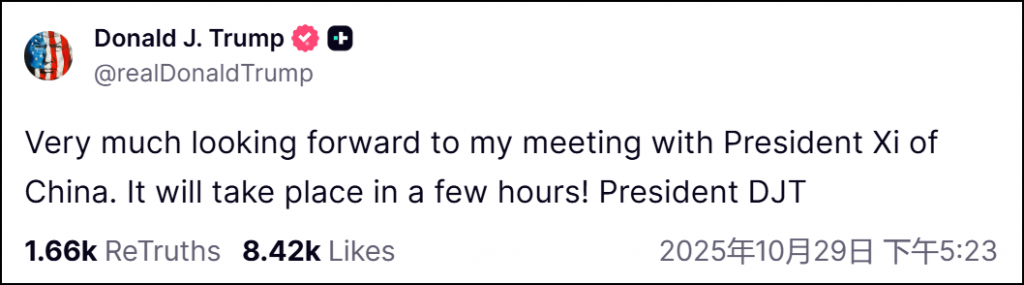 【路德社·快讯 ET 2025年10月29日】 韩国时间 10月29日18时19分,川普总统 TS: 我们把数万亿美元带回美国!这趟行程太棒了。和非常聪明、非常有才能、非常优秀的领导人打交道。明天,会见中国的习近平主席。这将会是一次对双方都非常棒的会面!!!——美利坚合众国总统 唐纳德·J·川普
