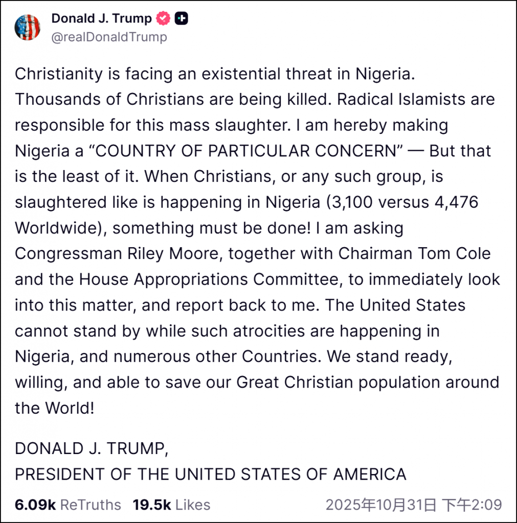 川普总统 TS:将尼日利亚列为“特别关注国家”,美国不会坐视基督徒被屠杀