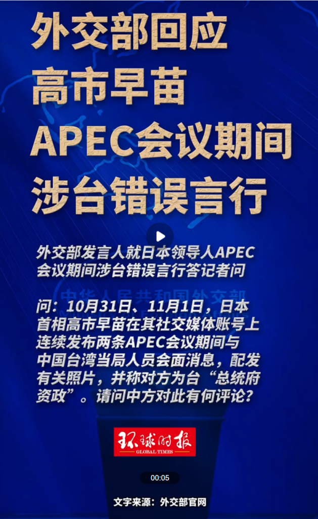 问:10月31日、11月1日,日本首相高市早苗在其社交媒体账号上连续发布两条APEC会议期间与中国台湾当局人员会面消息,配发有关照片,并称对方为台“总统府资政”。请问中方对此有何评论?