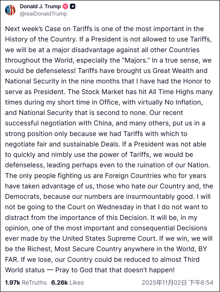 下周关于关税的这个案件,是我们国家历史上最重要的案件之一。如果总统不被允许使用关税,我们在面对全世界所有其他国家时都会处在巨大的劣势之下,尤其是那些“大国”。说白了,我们会毫无防御能力。关税在我有幸担任总统的这9个月里,给我们带来了巨大的财富和国家安全。在我上任这段很短的时间里,股市多次创下历史新高,几乎没有通胀,而且我们的国家安全是无人能比的。我们最近同中国,还有很多别的国家,成功达成的谈判之所以把我们放在一个非常有力的位置,只有一个原因:我们手里有关税,可以拿关税去谈一笔公平、可持续的协议。如果总统不能够快速而灵活地动用关税这种权力,我们会毫无防御能力,甚至可能把我们的国家带向毁灭。