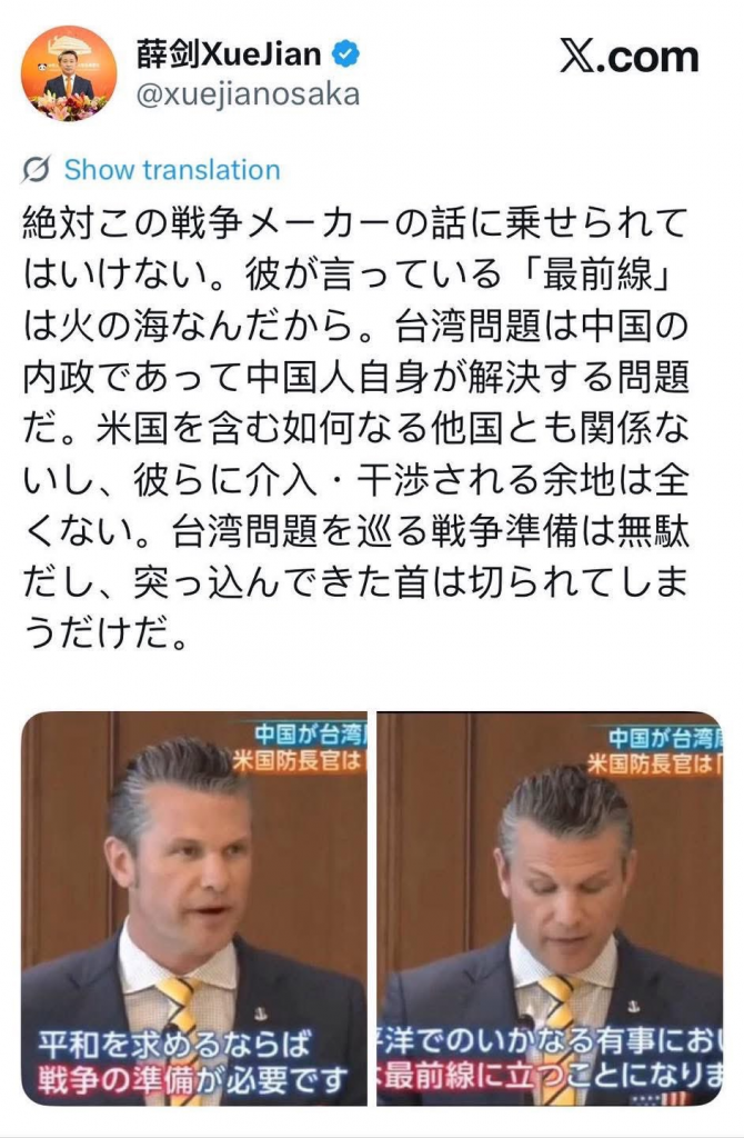 10月22日,中共驻大阪总领事薛剑威胁要“斩首”美战争部长海格塞斯薛剑发帖: