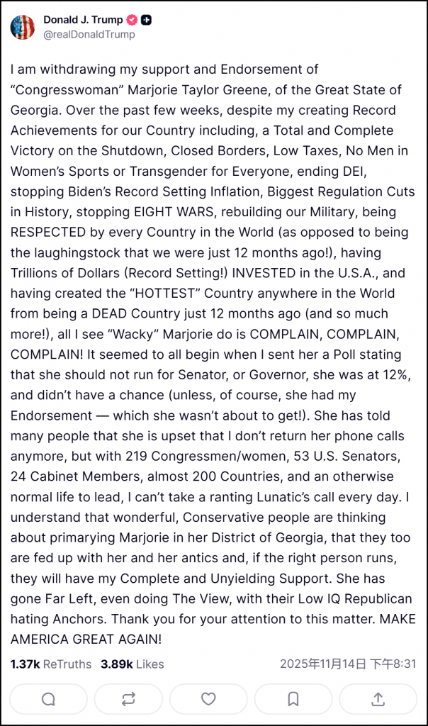 川普总统 TS:正式撤回对乔治亚州众议员玛玛乔丽·泰勒·格林的支持与背书