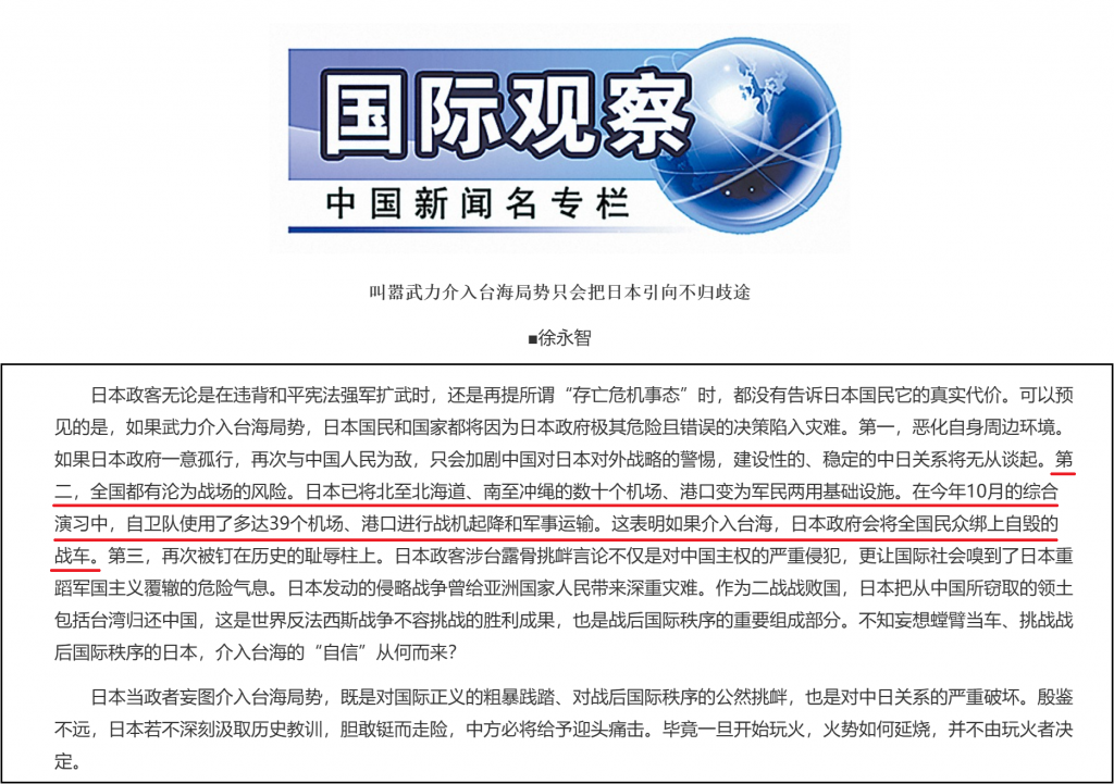 11月16日,中共解放军报在习近平的亲自指示下刊文《叫嚣武力介入台海局势只会把日本引向不归歧途》