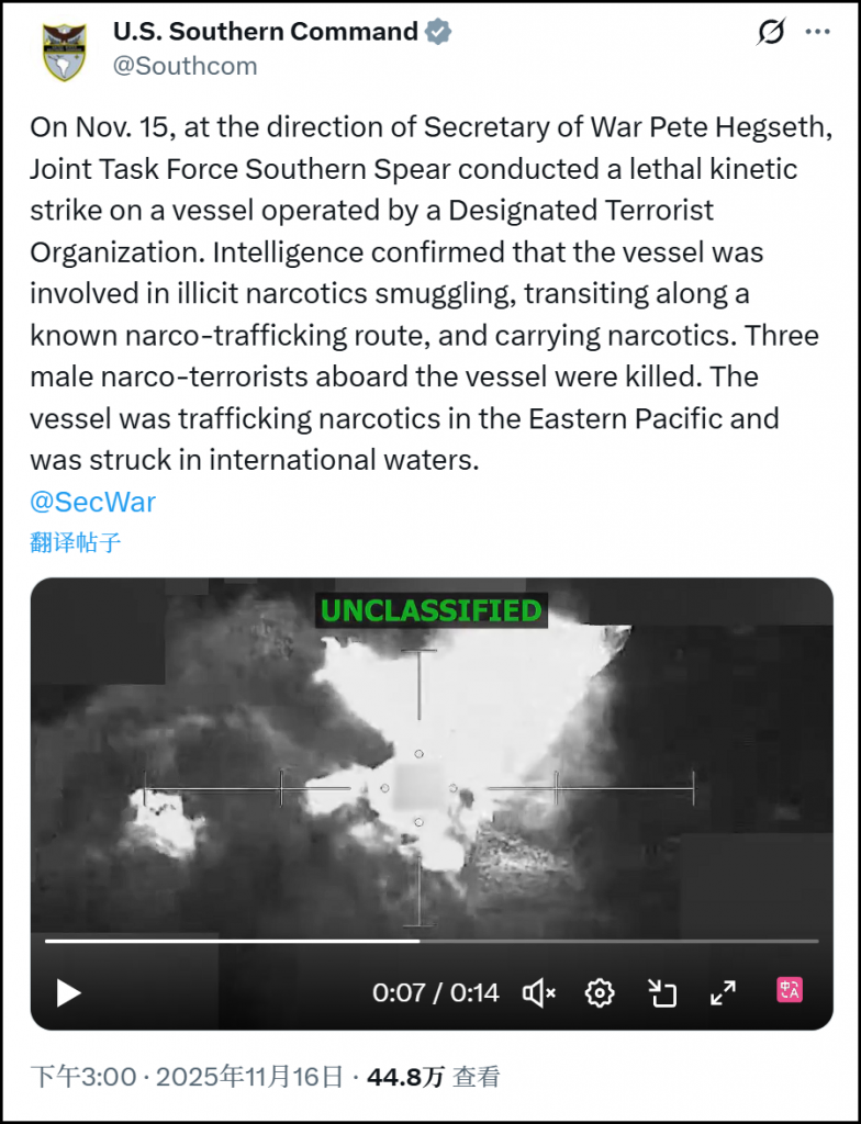 11月15日,在战争部长皮特·海格塞斯的指示下,“南方之矛”联合特遣部队对一艘由被指定恐怖组织操控的船只实施了致命动能打击。情报证实,该船参与非法毒品走私,正沿一条已知的贩毒航线航行,并装载毒品。船上3名男性贩毒恐怖分子被击毙。该船在东太平洋从事毒品走私时,于公海海域遭到打击。