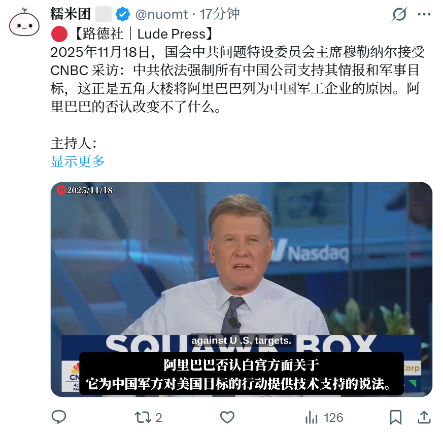 2025年11月18日,国会中共问题特设委员会主席穆勒纳尔接受 CNBC 采访:中共依法强制所有中国公司支持其情报和军事目标,这正是五角大楼将阿里巴巴列为中国军工企业的原因。阿里巴巴的否认改变不了什么。