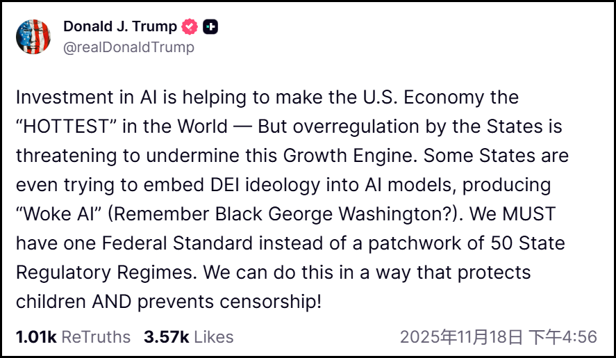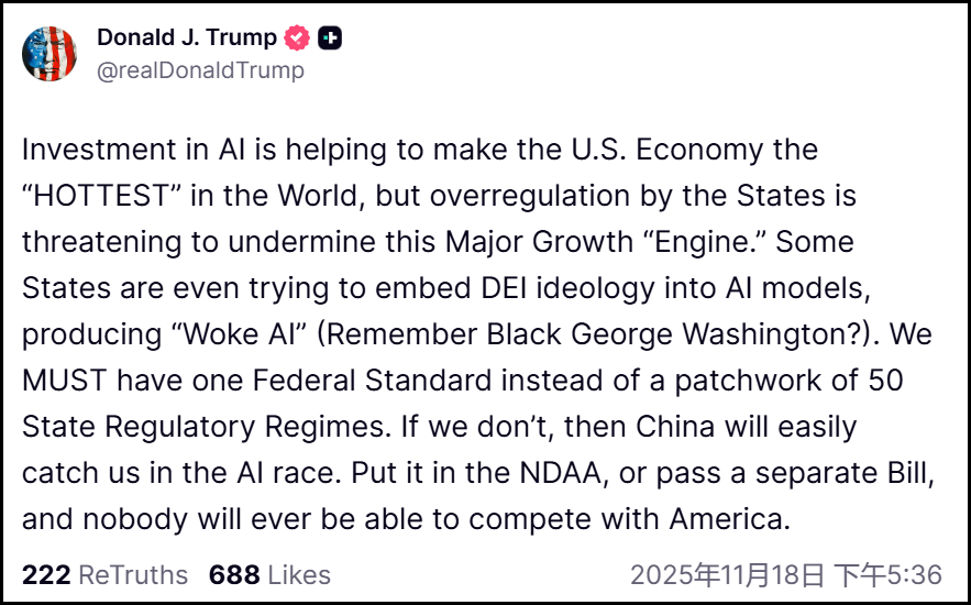 川普总统 TS:统一AI联邦监管标准并写进法案 确保美国在AI竞赛中继续领先中国