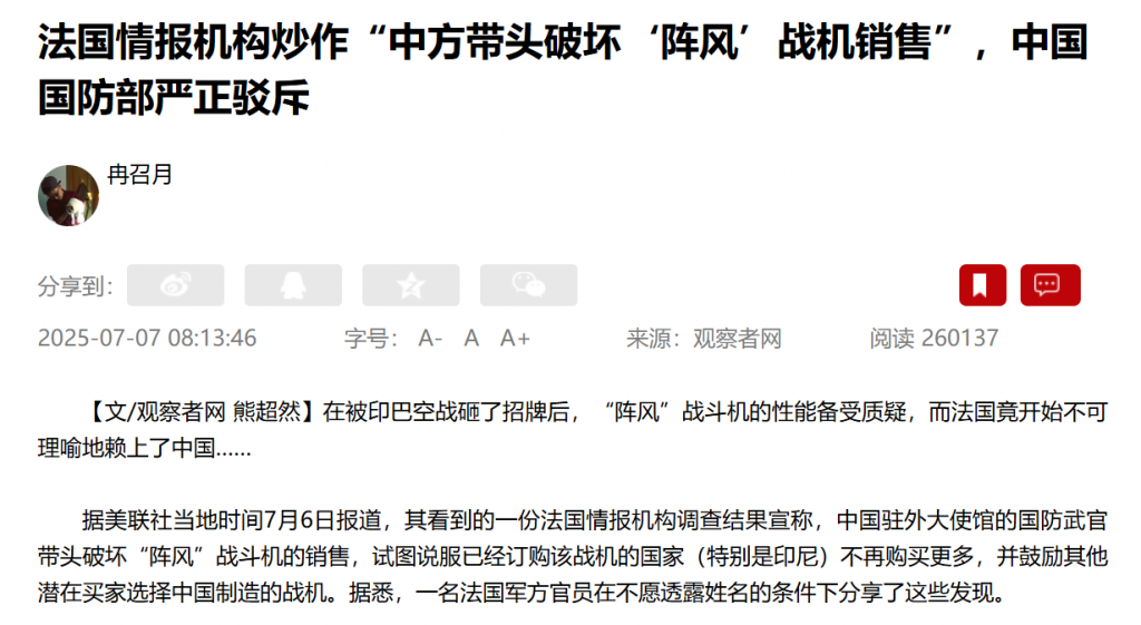 更加关键的是,美国会报告引述法国情报部门评估指出,中共国随后发动了一场有组织的“反阵风”虚假信息战:借由假账号在社交媒体上大量散布由人工智能生成或取自电子游戏画面的“残骸照片”,声称这些画面来自在印巴冲突中被中制导弹击落的“阵风”,刻意夸大法制战机的损失与缺陷;与此同时,中共驻外防务武官系统性地在各国游说,抹黑法国战机、鼓吹自家第5代隐身机J-35的“性价比”与技术优势。