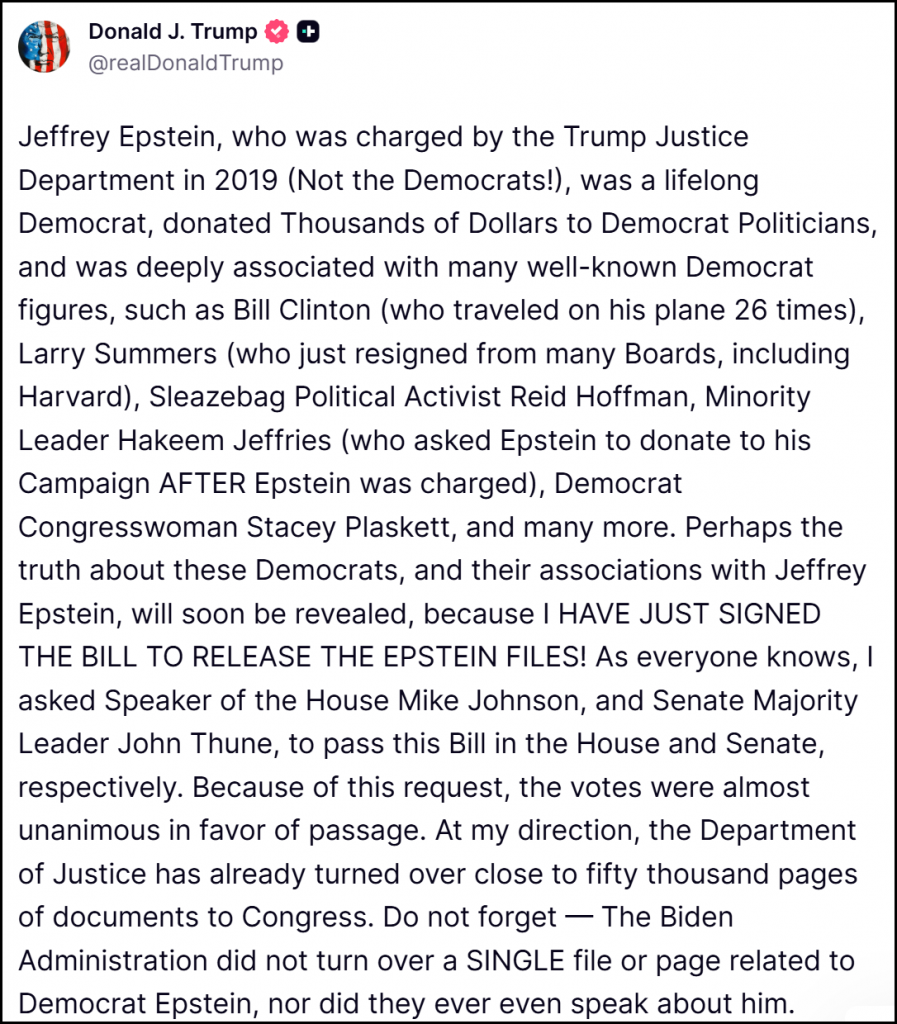 杰弗里·爱泼斯坦是在川普政府司法部于2019年发起指控的(不是民主党!)。他终身是民主党人,向民主党政客捐过成千上万美元的政治献金,并且同很多知名的民主党人物关系密切,比如比尔·克林顿(曾26次乘坐他的飞机)、刚刚从包括哈佛大学在内的多家董事会辞职的拉里·萨默斯、卑劣的政界活动家里德·霍夫曼、在爱泼斯坦被起诉之后还要求他为自己竞选活动捐款的少数党领袖哈基姆·杰弗里斯、民主党联邦众议员斯泰西·普拉斯基特等等。也许,有关这些民主党人以及他们与杰弗里·爱泼斯坦之间关系的真相,很快就会被揭露出来,因为我刚刚签署了公布爱泼斯坦档案的法案!