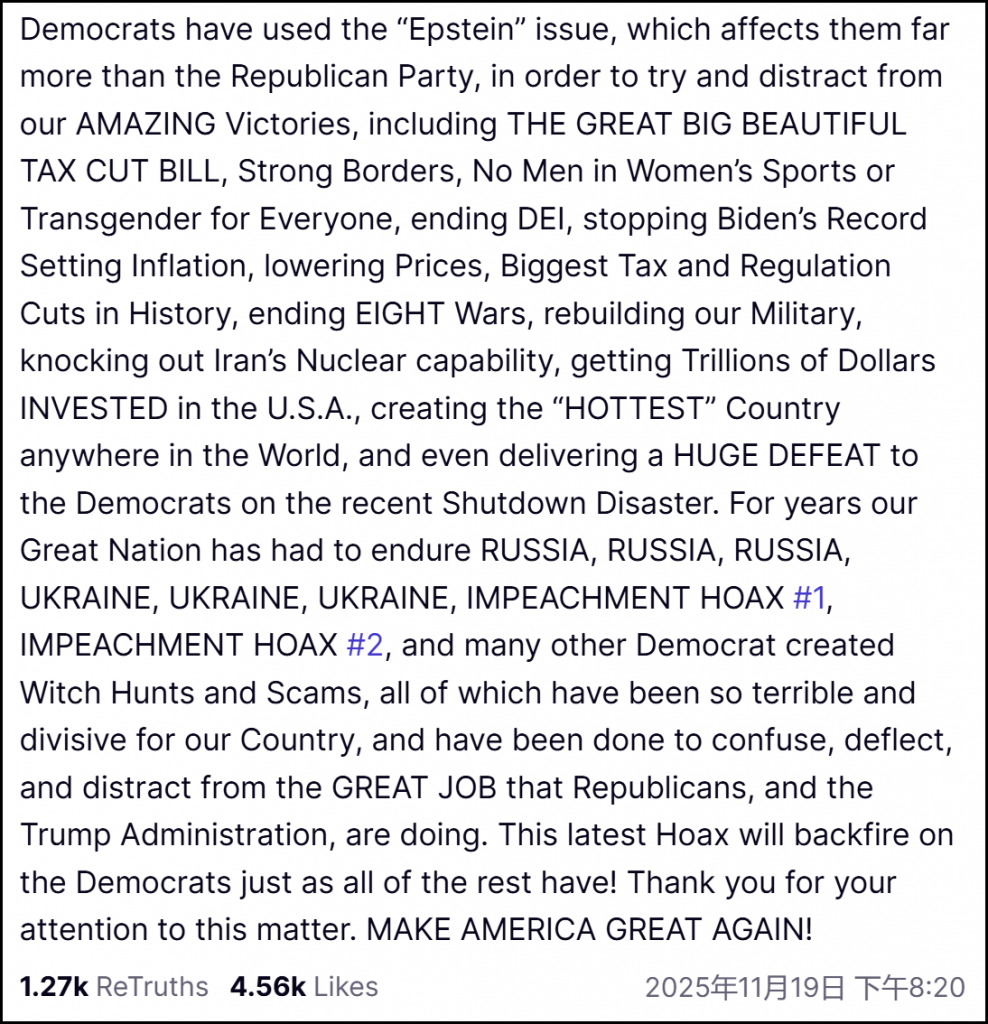 民主党人一直在利用“爱泼斯坦”这个议题——这个议题对他们的伤害远远大于对共和党的伤害——试图转移人们对我们这些惊人成就的注意力,包括那部伟大又巨大又美妙的减税法案、强有力的边境管控、不再允许男性参加女子体育项目、也不搞“人人都是跨性别”的那一套、终结“多元、公平与包容”(DEI)、阻止拜登创纪录的通胀、压低物价、实施美国历史上最大规模的减税与减规管、结束8场战争、重建我们的军队、摧毁伊朗的核能力、让数万亿美元投资流向美国、把美国打造成世界上“最火热”的国家,甚至在最近那场政府关门危机中给民主党送上一场巨大失败。
