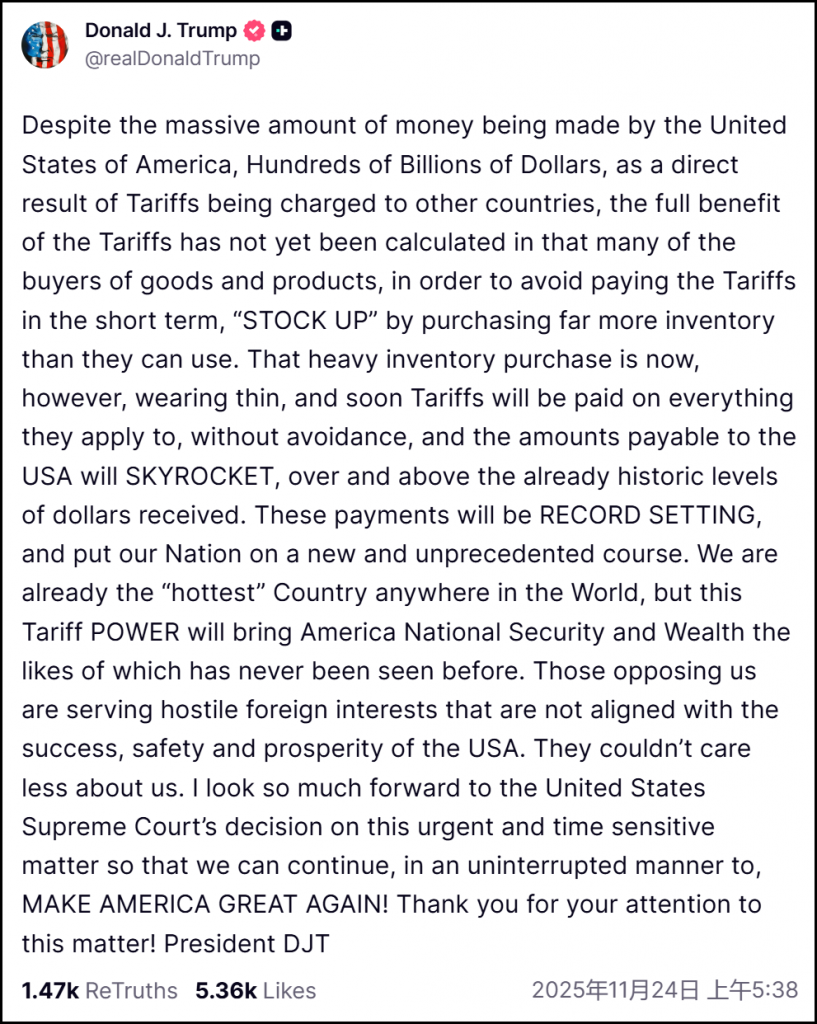 我们已经是世界上最炙手可热的国家,但这种关税力量还将为美国带来前所未有的国家安全与财富。那些反对我们的人,实际上是在为敌对的外国利益服务,这些利益与美国的成功、安全和繁荣背道而驰,他们根本不关心我们。我非常期待美国最高法院就这一紧迫而时间敏感的问题作出裁决,这样我们就能够不受干扰地继续让美国再次伟大!感谢您对此事的关注!