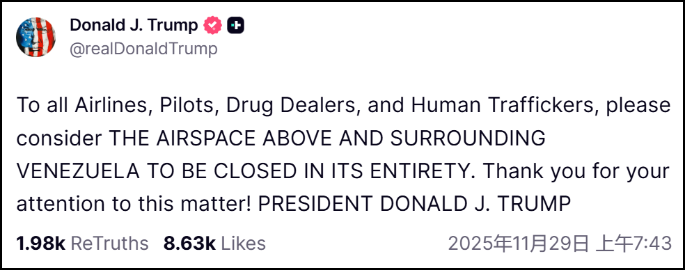 川普总统致所有航空公司、飞行员、贩毒分子和人口贩运者:请将委内瑞拉上空及其周边的全部空域视为完全关闭