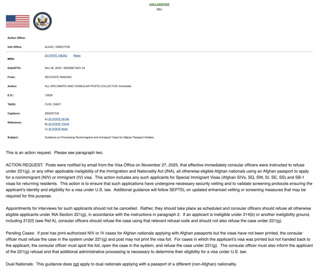 行动请求:各驻外机构已于2025年11月27日收到签证办公室发出的电子邮件通知,自即日起,领事官员须根据《移民与国籍法》(INA)第221(g)条,或任何其它适用的不得受理条款,拒绝所有原本符合资格、但使用阿富汗护照申请非移民签证(NIV)或移民签证(IV)的阿富汗公民。本措施也适用于所有此类特殊移民签证(阿富汗SIVs、SQ、SW、SI、SE、SS类别)申请人,以及为回美居民签发的SB-1签证申请人。采取此项行动,是为确保相关签证申请已经过必要的安全审查,并验证筛查流程,确保申请人身份及其在美国法律下取得签证的资格。关于为此目的可能需要的更新版强化审查或筛查措施,将通过另行电报(SEPTEL)提供补充指引。
