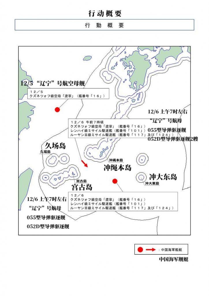 包括001型航母“辽宁”号、1艘055型导弹驱逐舰(舷号“101”)以及2艘052D型导弹驱逐舰(舷号“117”和“124”)在内的共4艘舰艇,自冲绳本岛与宫古岛之间的海域向南东方向航行,驶向太平洋。