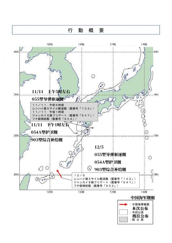 随后,又确认这些舰艇经冲绳本岛与宫古岛之间的海域向西北航行,驶向东海。此外,上述舰艇与11月11日(星期二)经大隅海峡向东航行的舰艇为同一批。
