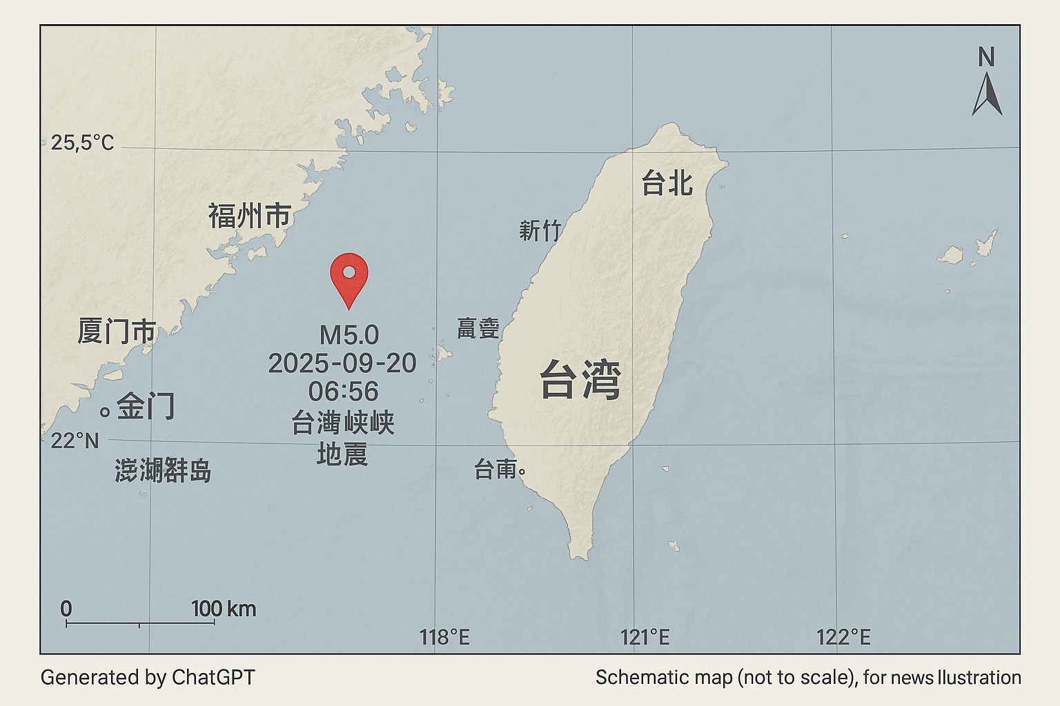 台湾海峡清晨发生规模5.0地震,最大震度2级—9/20/2025【路德社·简讯 ET 2025年9月19日】…