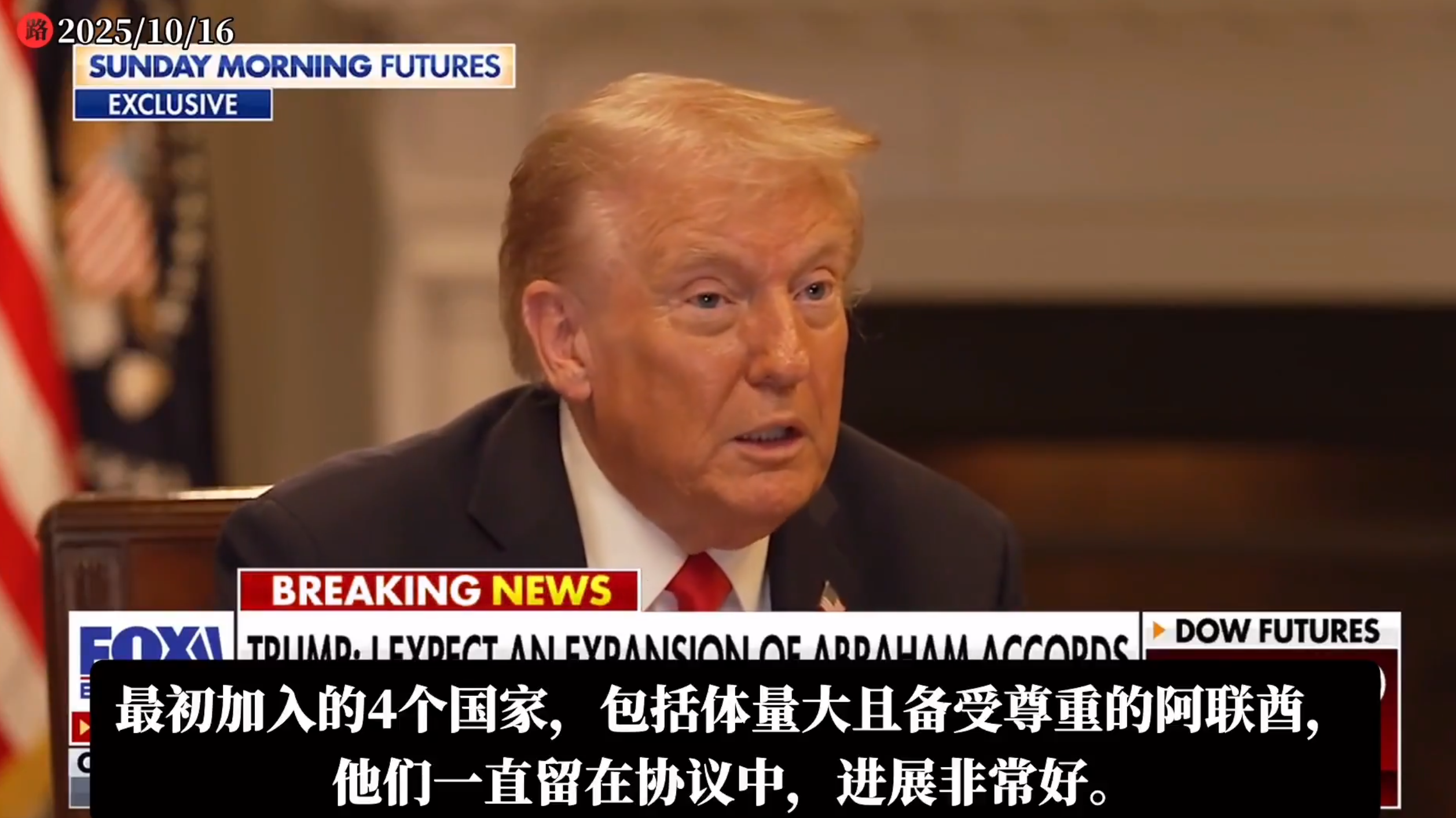 川普称“亚伯拉罕协议”将很快扩展,沙特加入或带动更多国家2025年10月16日,川普总统接受Fox玛丽亚的独家采访。在节目中,主持人玛丽亚提问:“您是否预期‘亚伯拉罕协议’将扩展?”川普总统回应:“是的,几乎就在近期。我不想用‘立刻’这个词,但会很快。”