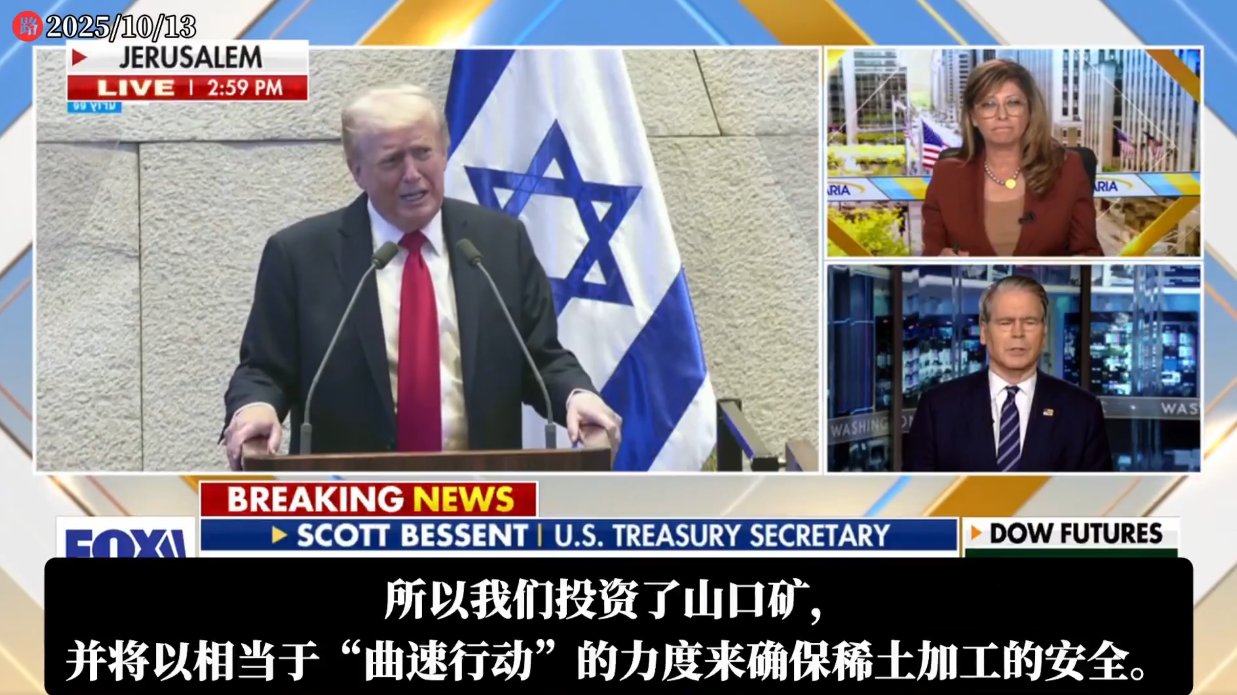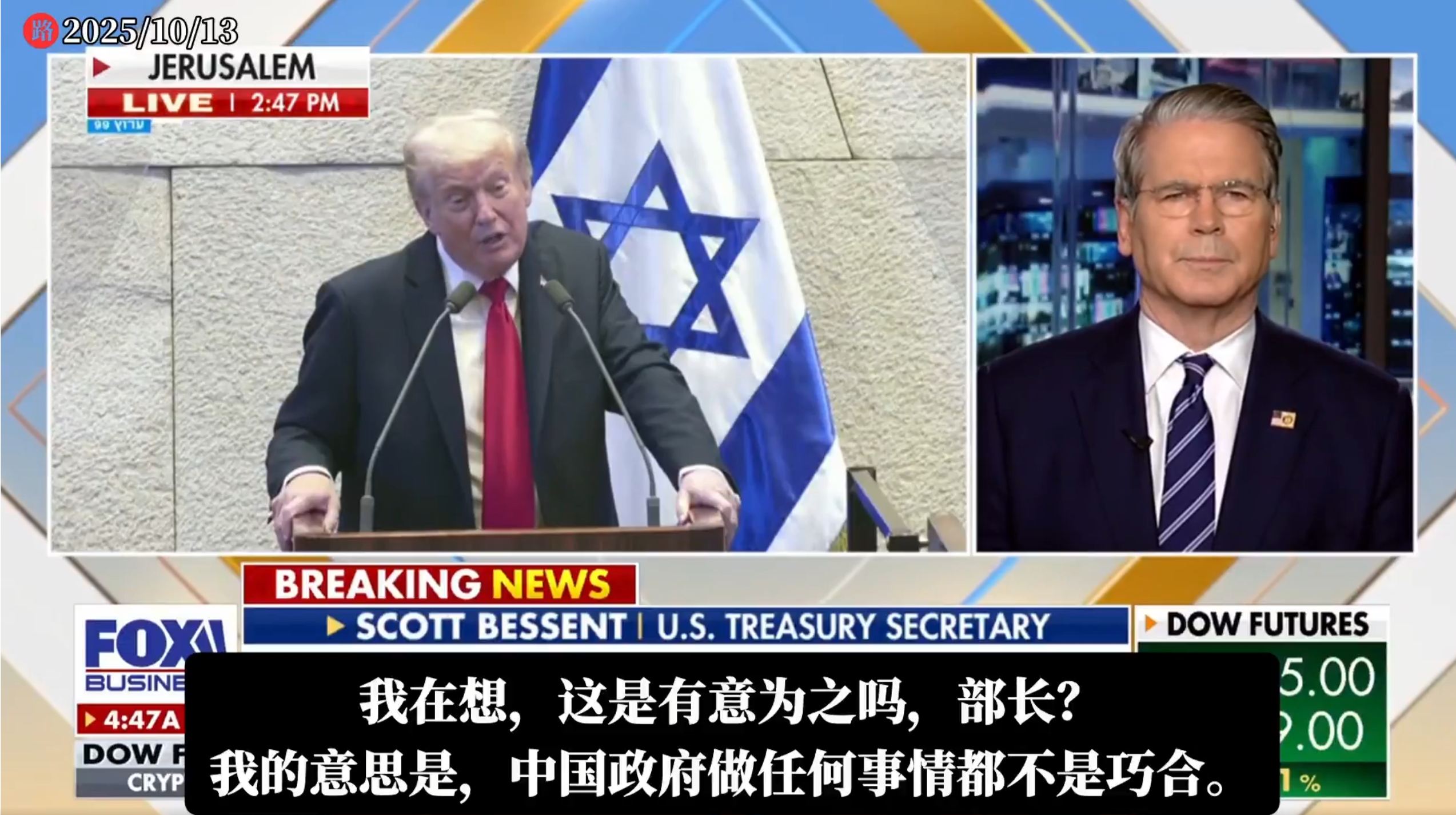 财长贝森特谈摆脱中共供应链:我们已经看到,无论是关键矿产还是关键物资,中国都可能成为全球不可靠的供应商。而他们上周的声明,等于是公开向全世界叫板。2025年10月13日,财政部长贝森特在Fox节目中,被问“未来几年你们如何布局,让这个国家实现独立性,从而不再依赖中国供应链?”他先回到判断与背景:新冠时期“其实是一次预演”;“我们已经看到,无论是关键矿产还是关键物资,中国都可能成为全球不可靠的供应商。而他们上周的声明,等于是公开向全世界叫板(They’ve taken on the whole world)。”他表示,“我们将拭目以待,看他们是否愿意成为可靠的供应商。”