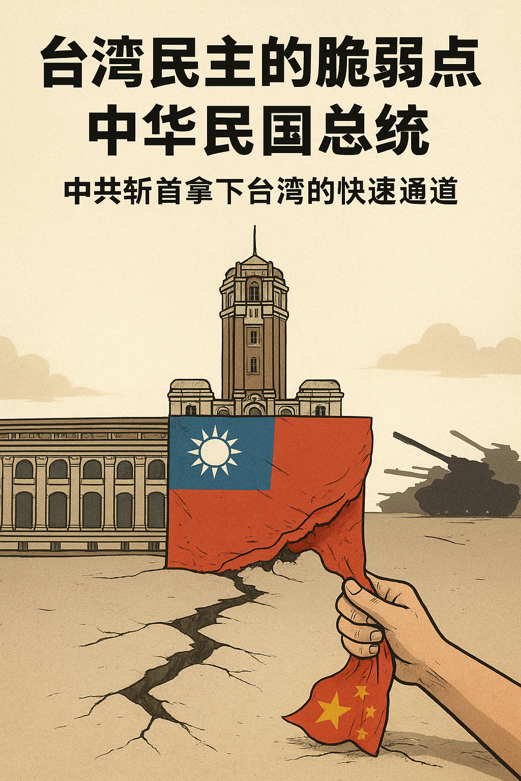 台湾民主的脆弱点,中华民国总统台湾的命运,可能在极端情况下,不是由2300万民众的集体意志决定,而是集中在一位总统的一句话之上。这为中共提供了一个斩首式的快速通道:只要使台湾总统屈服或被迫签署放弃声明,就能合法拿下台湾,而无需打一场全面战争。