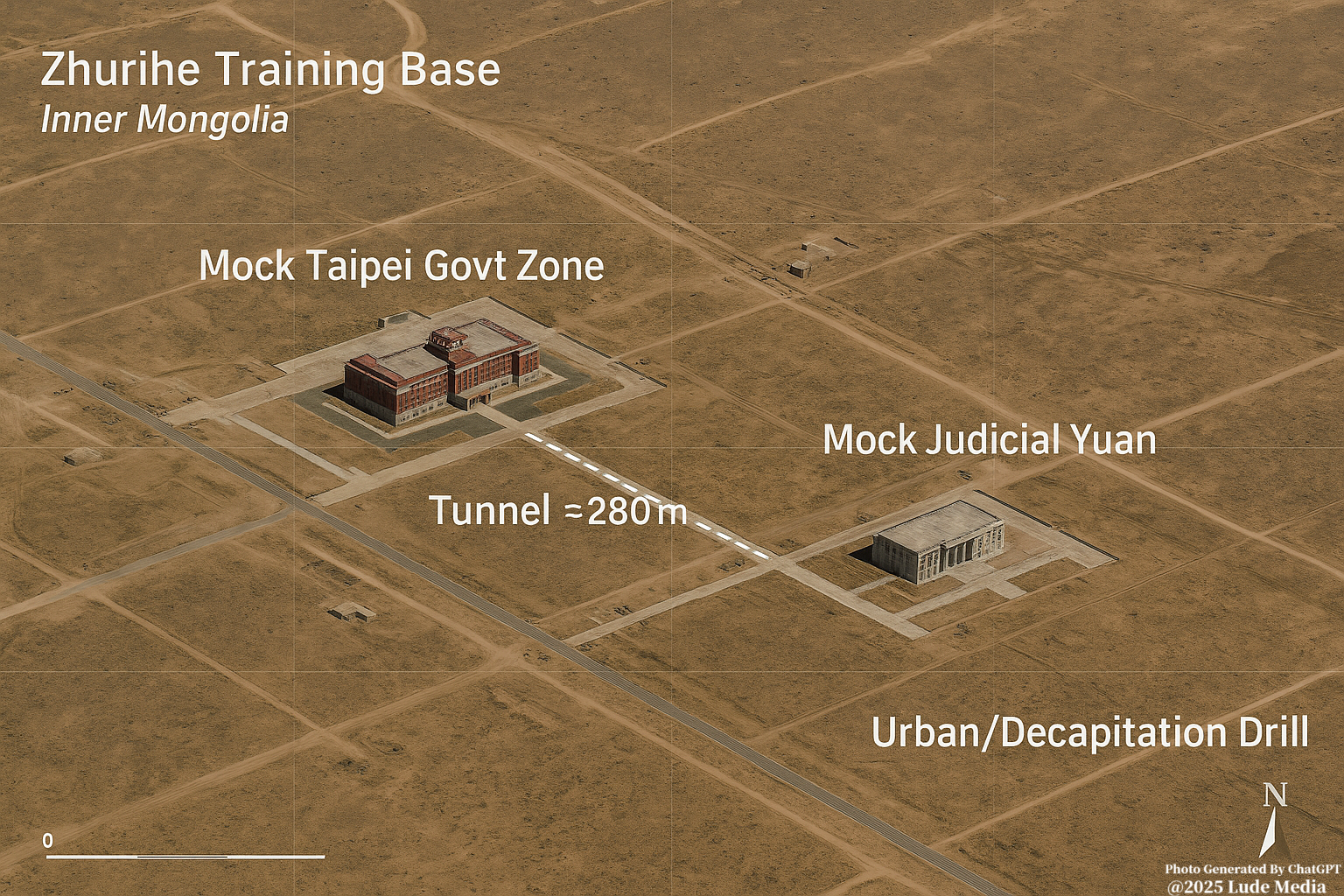 中共在内蒙古扩建“仿台北政府中枢”:280米地道连通“司法院”与“总统府”,斩首与都会战训练系统加码日本智库“国家基本问题研究所”取得的卫星图像显示,中共国解放军在内蒙古朱日和联合作战战术训练基地,持续扩建“仿台北”训练区:在既有的“仿总统府”与“仿外交部”之外,新建“仿司法院”,并以约280米的地道与“仿总统府”相连;训练区自2020年以来规模接近扩大至原来的3倍。多次出现的装甲车辆、路障与破障科目,显示旅/营级都会战与“斩首作战”演练处于常态化节奏。