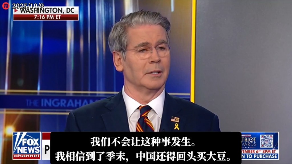 在农业与大宗贸易上,贝森特直指中方“政治化采购”的做法:“还有把美国豆农当作人质,把大豆采购政治化,…
